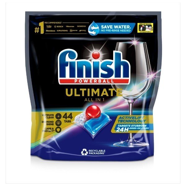 Finish Ultimate Original 44 Dishwasher 550G, from the #1 Recommended brand*, Finish Ultimate dishwasher tablets, provides ultimate clean on your dishes and glasses, 1st time everytime. Finish Activelift Technology Targets stubborn 24H Dried-on Stains, without the need to pre-rinse.